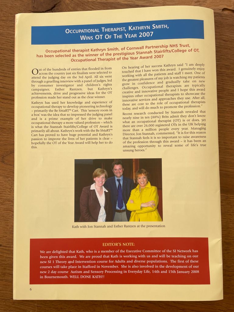 Her Parenting Through the Senses Programme and Sensory Ladders were incorporated into national training; they were shared as part of parent education days, the 3-day Understanding Sensory Processing workshops, and with therapists learning about Sensory Integration on modules SI1, SI2, and later, from 2010, SI2/3.