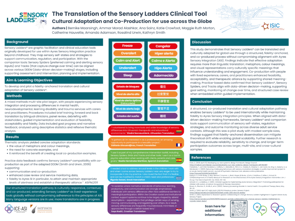 This research poster presents findings from a pioneering multi-site pilot study on the translation and cultural adaptation of Sensory Ladders®, a clinical tool designed to support sensory regulation,communication, and participation for individuals with sensory integration and processing differences.